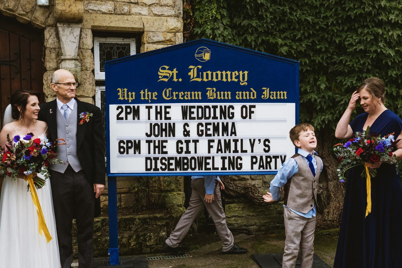 Gemma’s gorgeous; John her perfect partner and you can see their love and laughter just bursts from the screen. There’s every bit of wedding magic here: the stunning dress and fabulous suit, the beautiful bouquet, the lovely venue full of fairy lights… and that’s just for starters. The props and signage are utter genius, the entire day just looks incredible. Often I’ll try to pick out a favourite ‘bit’ of a wedding we feature here, but (dead parrots, spam and eggs notwithstanding) I can’t choose which moments I love best, and I can’t stop scrolling and laughing at John and Gemma’s uniquely wonderful day!