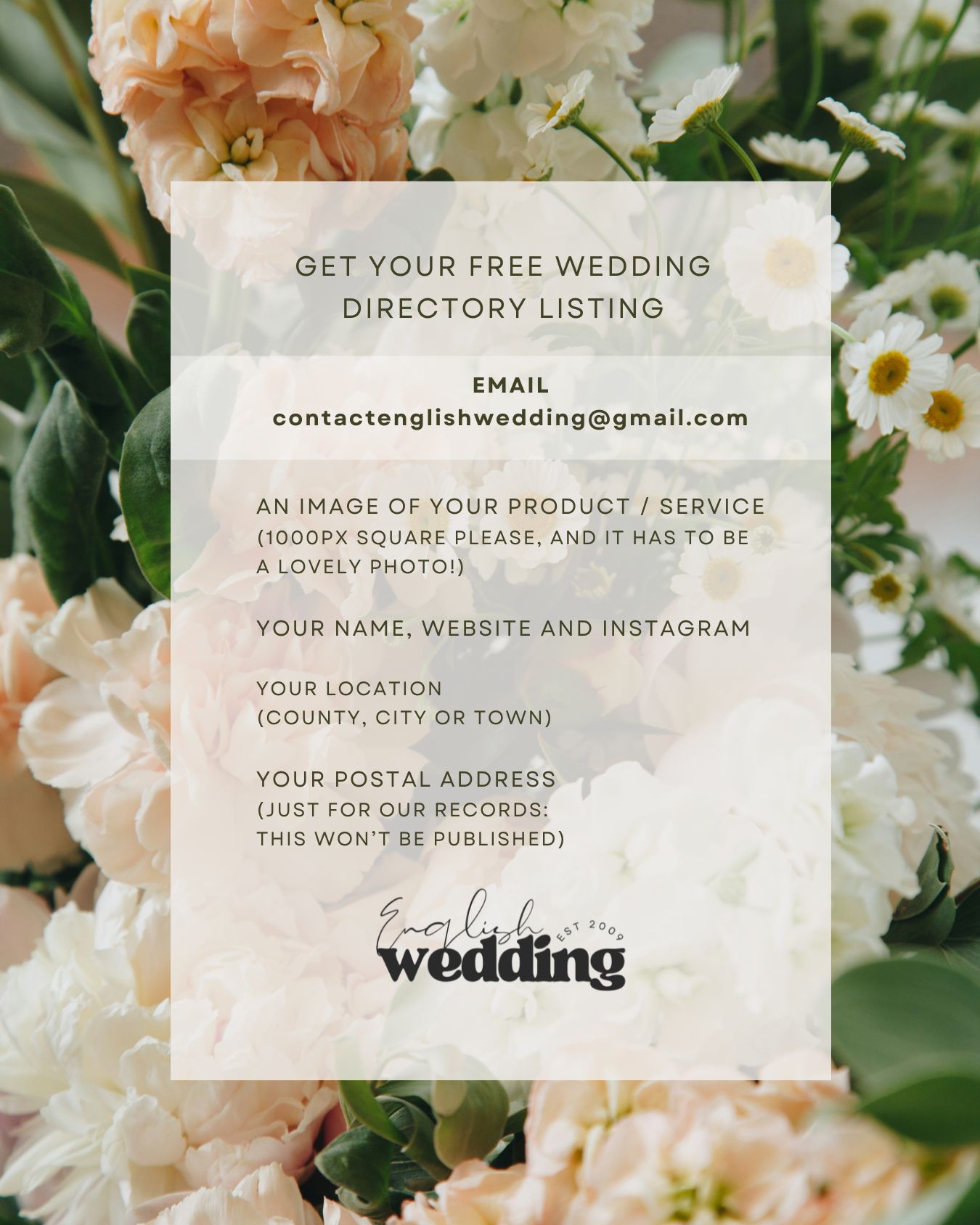 In December I set up this offer for all UK wedding suppliers. It’s simple, genuine and best of all – it’s been extended for the whole of January. If you’re a wedding supplier working with UK couples, send your details to be listed in the English Wedding directory today!