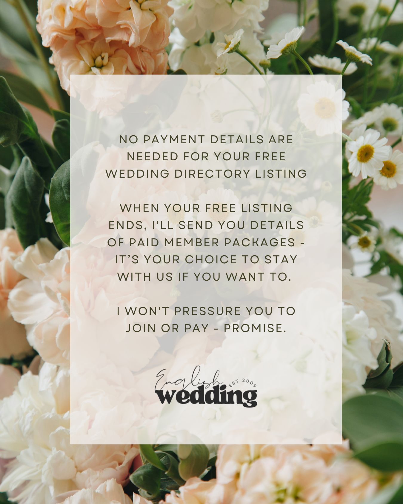 In December I set up this offer for all UK wedding suppliers. It’s simple, genuine and best of all – it’s been extended for the whole of January. If you’re a wedding supplier working with UK couples, send your details to be listed in the English Wedding directory today!